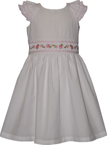 This full-of-charm frock is framed by fluttering sleeves and centered with a flowery stitched waistband.