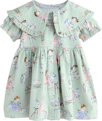 Keep them playing comfortably in this cotton-jersey party dress featuring a ruffle-trimmed collar and buttons down the front.