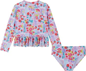 They'll love to splash and play in this printed two-piece swimsuit topped by a long-sleeve rashguard and paired with matching bottoms.