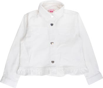 A classic stretch-denim jacket gets the label's signature cuteness overload in a white wash with heart-shaped snaps and a ruffled hem.