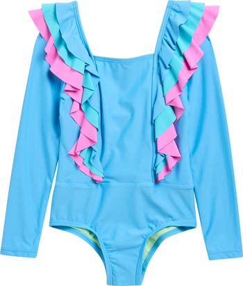 Bring an air of playfulness to their next pool day with this one-piece swimsuit featuring colorful ruffles that really stand out. The long-sleeves keep them effortlessly protected from the sun, sand and surf.