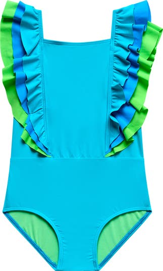 Tranquil lagoon colorblocking adds to the fun of this one-piece swimsuit flounced in frilly ruffles to delight your beach-ready kiddo.