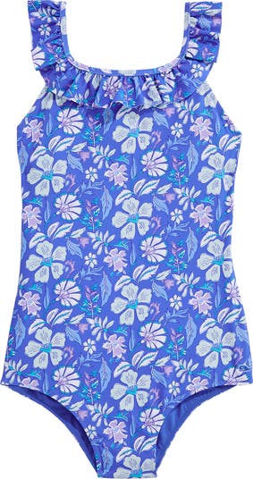 Let them splash and play in this fun frill-trimmed swimsuit covered in a beach-ready print.
