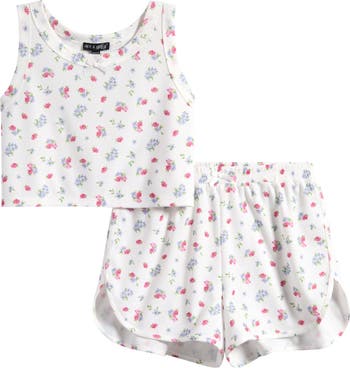 Sweet bows and an adorable floral print give a playful, sleepover-ready look to these softly ribbed pajamas.