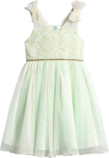 Sparkling trim at the waist enhances the party-worthy appeal of this flouncy ballerina-inspired dress made of shimmery tulle and topped with playful ruffles at the shoulder.