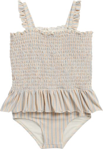 Built-in sun protection adds confidence to this one-piece swimsuit made with a stretchy smocked bodice, sweet ruffles and a fluttery peplum.