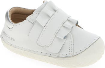 A ruffled strap gives a charming finish to this shiny leather sneaker built for new walkers.