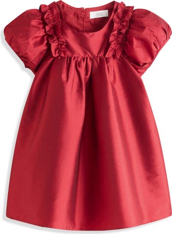 A red taffeta dress gets even sweeter with ruffles and puff sleeves your junior party goer will love.