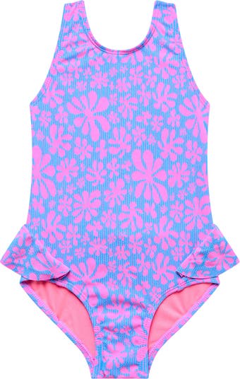 They'll love to splash and play in this textured one-piece swimsuit made with a fluttery ruffle and vibrant blooms.