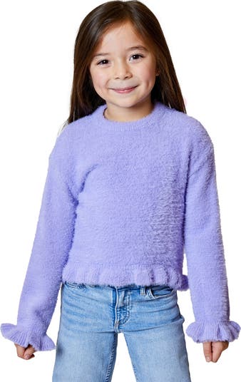 Ruffle cuffs and hems add kid-approved frill to this pretty purple sweater with a soft handfeel.