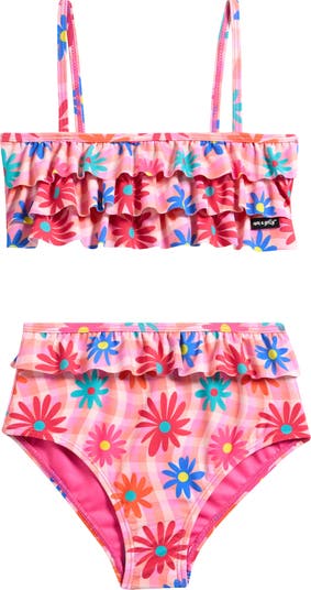 They'll be ready to soak up the sunshine in this ruffled two-piece swimsuit that's patterned in a floral plaid print.