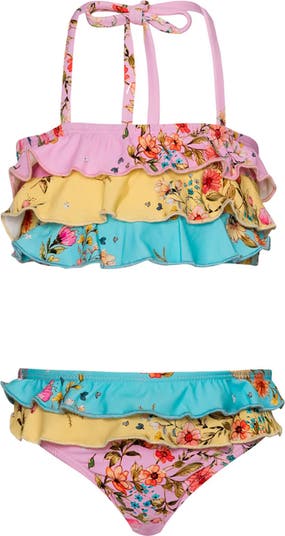Sweet wildflowers detail the colorful ruffles on this two-piece swimsuit that's ready for a day in the sun.