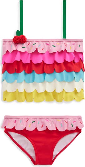 Tiered ruffles give a layered look to this ultrasweet two-piece swimsuit detailed with three-dimensional cherries at one strap and embroidered sprinkles along the top tier.