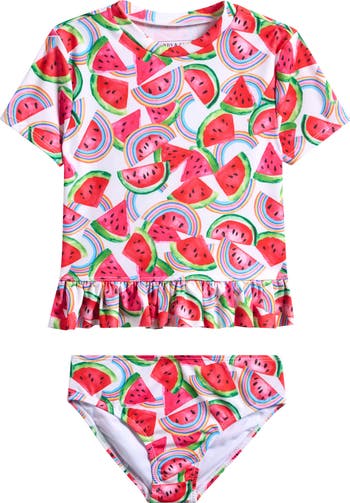 They'll love to splash and play in this two-piece swimsuit topped by a short-sleeve rashguard and paired with matching bottoms.