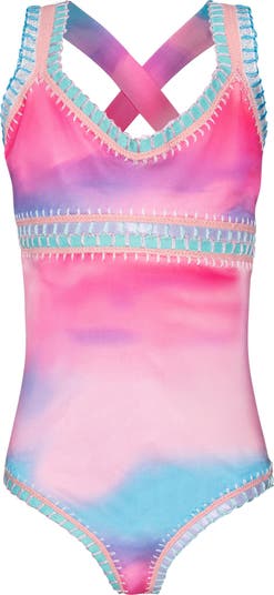 Rainbow-hued trim and whipstitching lend kid-approved style to this one-piece swimsuit ready to make a splash.