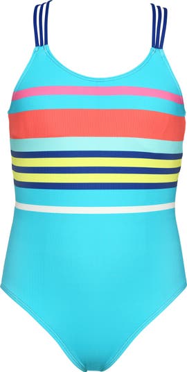 Watch them channel their most athletic selves in this striped one-piece with strappy detailing.