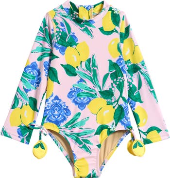 Long sleeves keep your youngster protected from the sun, sand and surf as they play in this one-piece swimsuit made with embroidered appliqué details falling from side ties.