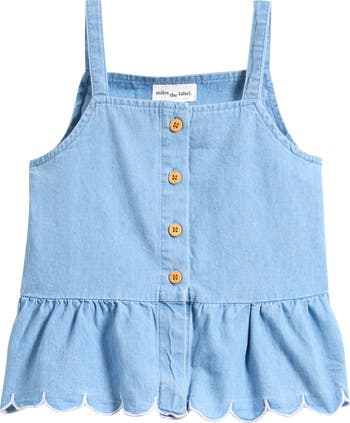 Fresh, airy chambray made from organic cotton keeps your tiny trendsetter comfy in this button-front tank finished with a dramatically ruffled and scalloped peplum.