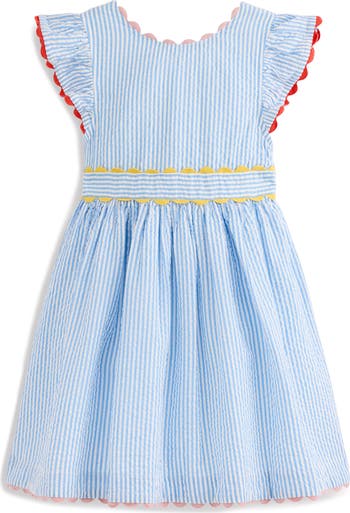 Keep them picture-perfect in this airy cotton-seersucker dress, framed by flutter sleeves and finished with colorblocked scalloped trim.