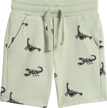 A scorpion pattern amps up the cool factor in these drawstring-waist shorts made from stretchy organic cotton.