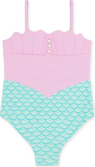 Watch them splash and play in this quick-drying, mermaid-inspired one-piece swimsuit made with scalloped edges and faux-pearl details.