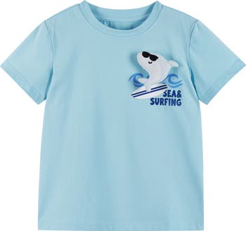 A playful 3D-appliqué shark hangs fin on this soft stretch-cotton T-shirt, combining easy comfort with warm-weather fun.