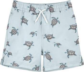 Sea turtles swim across these comfy quick-drying swim trunks designed for hours of play in sand or sea.