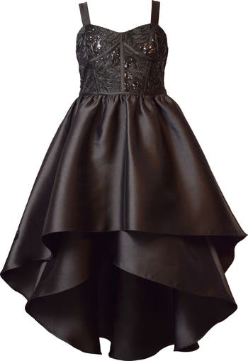They'll be ready to twirl in this standout party dress featuring a beaded, structured bodice and a voluminous mikado skirt with a high-low hem.
