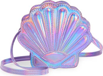 An iridescent finish adds to the irresistible charm of this faux-leather crossbody bag fashioned in the shape of a seashell.