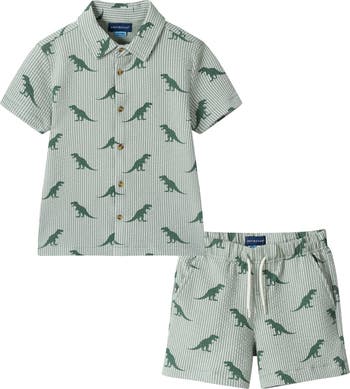 A charming print highlights a button-up shirt paired with matching shorts made from a cotton-blend seersucker so your kiddo looks dapper and feels comfortable in any setting.