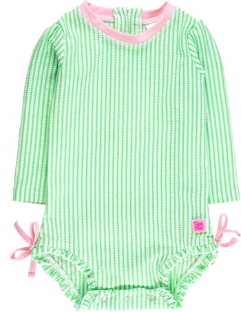 Get your little splasher ready for a day of water fun in this long-sleeve one-piece swimsuit featuring a fun pattern, signature ruffles and built-in sun protection.