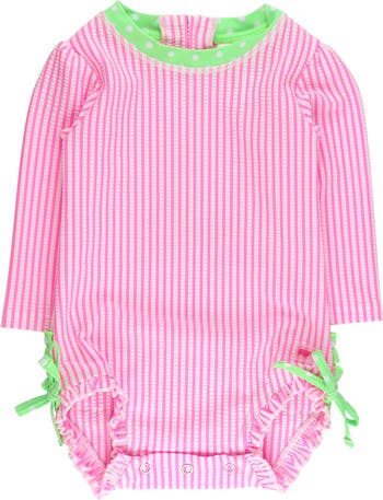 Seersucker stripes pattern a long-sleeve rashguard swimsuit featuring signature ruffles across the rear.