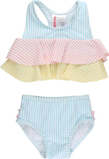 Signature ruffles and a gingham print bring sweet style to this colorful two-piece swimsuit that is picture-perfect.