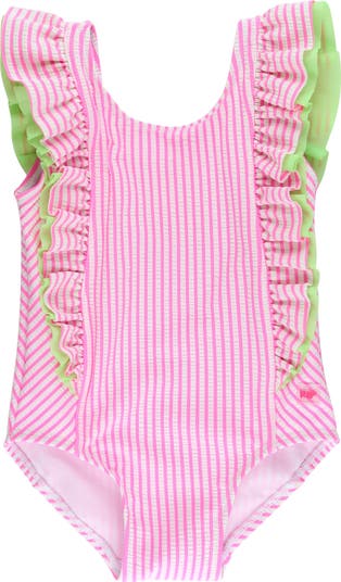 Bows and ruffles add fun flair to this seersucker one-piece outfitted with built-in sun protection.