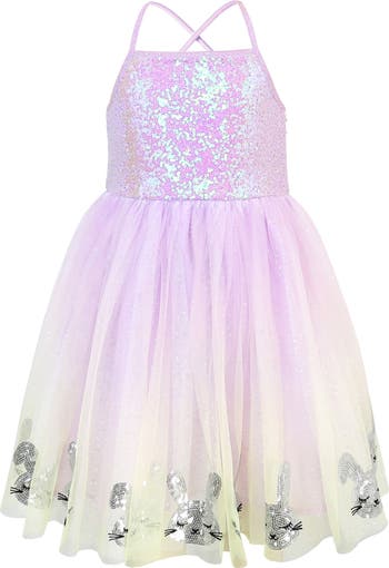 Dazzling sequins cover the bodice and comprise the gentle bunnies bordering the hem of this supercute tulle party dress fashioned with a sparkly glitter-dotted ombré skirt.