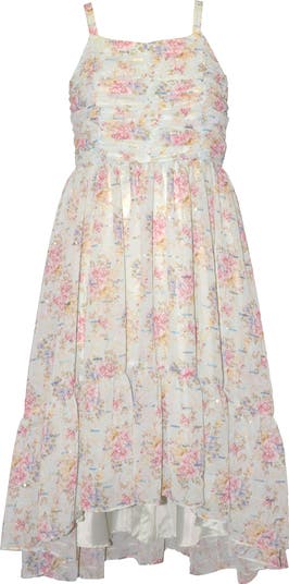 Sparkling sequins illuminate the pleated chiffon on this fluttery dress done up in a lovely floral print.