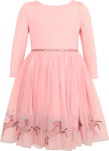 A solid bodice framed by three-quarter sleeves tops this kid-size party dress with a playful skirt adorned by reindeer and shimmery sequins.