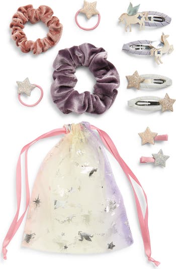 Your little trendsetter will love creating fun hairstyles with this assorted set of hair accessories that come in a sparkly drawstring pouch for storage.