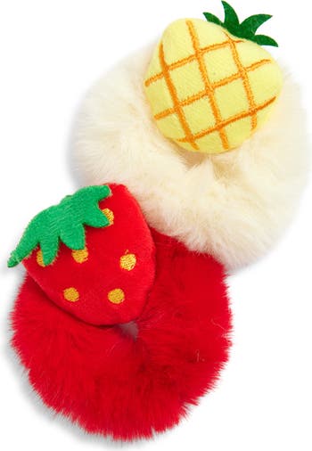 Fuzzy scrunchies with yummy fruit accents are just the accessories your kid will want to brighten up their updos.