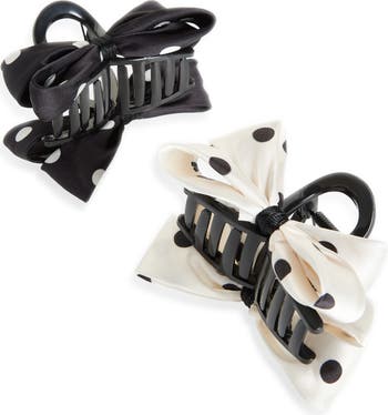 Fluttery polka-dot bows top this set of two jaw clips designed to keep their hair in place for a picture-perfect look.