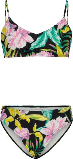 They'll love jumping in the water and lounging poolside in this two-piece swimsuit featuring a playful tropical print.