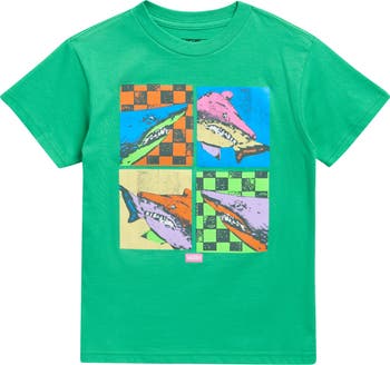 It's easy to make a splash in this all-cotton T-shirt that's sized for kids and covered with toothy sharks and colorful checkerboards. Perfect for playtime, downtime and every time in between, it's a great addition to any land-or-sea wardrobe.