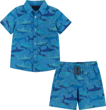 Watch your favorite little one explore their world in this matching set featuring a button-up shirt and matching shorts covered in a shark print.