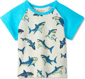 This soft cotton T-shirt invites tiny imaginations to explore underwater worlds with delightfully tactile, glow-in-the-dark graphic of cool sharks.
