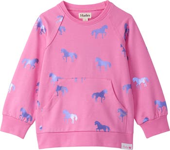 A print of shimmery metallic horses brings kid-approved style to this French terry sweatshirt outfitted with a large kangaroo pocket.