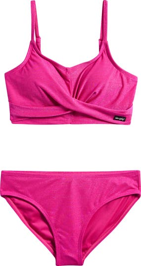 This two-piece swimsuit with a twisted top and made from sun-catching fabric is perfect for kids who love to shimmer.