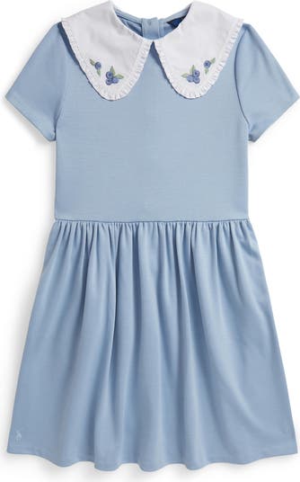 A ruffle-trimmed Peter Pan collar delicately embroidered with blueberries brings a vintage vibe to this kid-sized dress made from soft ponte.