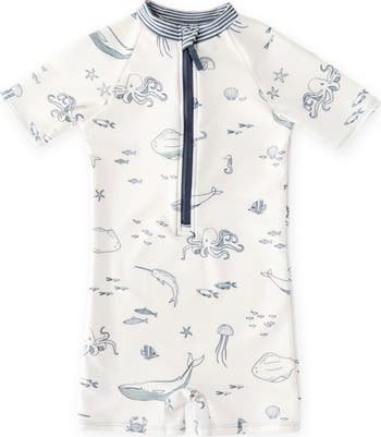 A half-zip placket makes it easy to get your little one into this stretchy rashguard swimsuit that's framed by short sleeves.