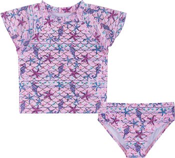 Watch them channel their inner mer-child in this two-piece swimsuit made with a raglan-sleeve rashguard and matching bottoms.