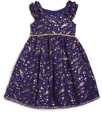 Flutter sleeves and a cosmic foil print elevate this fit-and-flare party dress that'll make sure they shine bright at their next special event.